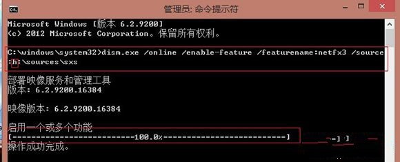 然后在命令里输入dism.exe/online/enable-feature/featurename:NetFX3 /Source:H:sourcessxs(“H”为我的虚拟光驱的盘符)。