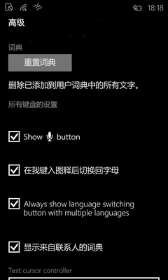 在这里你就会看到英文显示的“总是显示多语言切换按钮”选项,勾选该选项。然后再打开Win10 Build 10051手机键盘,你就会发现中英文输入法切换键已经回来了。如图:
