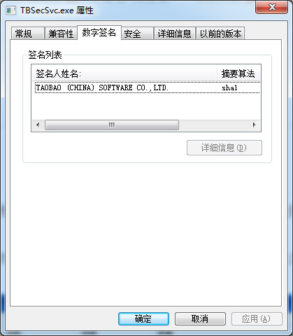这个文件的数字签名里显示签名人是TAOBAO,如下图: