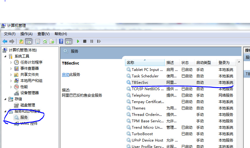 方法一:控制面板里面的管理工具里面的服务,找到“TBSecSvc"服务,更改它的属性,选为:停止。