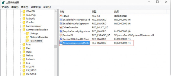 3、创建DWORD值并命名为AllowInsecureGuestAuth值为1即可。