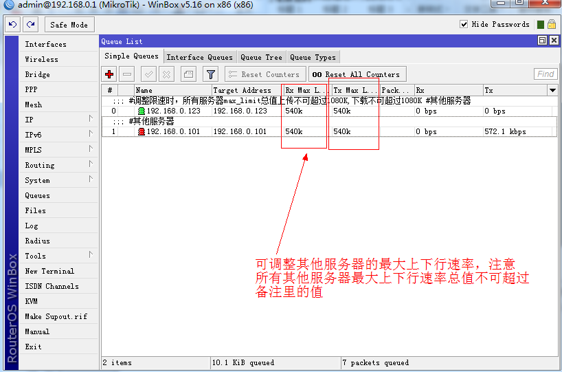 A5:收银机会被添加到其他服务器里,其他服务器会在simple Queue里被限速,默认所有其他服务器均分其他服务器的总带宽,其他服务器的总带宽=网吧所有线路带宽*0.9*0.3,如要限制收银机速率可在simple Queue 里修改收银IP的上下行速率,如下图