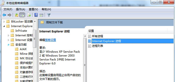 2、依次点击展开左侧菜单中“计算机配置”-“管理模板”、“Windows组件”-“Internet Explorer”-“安全功能”-“限制文件下载”;