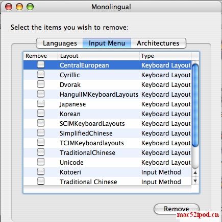 第 一个是删除多余的语言包,选中不要的,点界面右下脚的remove,就可以了。删除是面向整个启动硬盘的,即无论系统的还是各个程序的,你选种的语言包 都会被删除。对于中国用户,wonsore建议保留english和simple chinese就可以了。注意:english切不可删除。否则会导致很多软件无法使用。