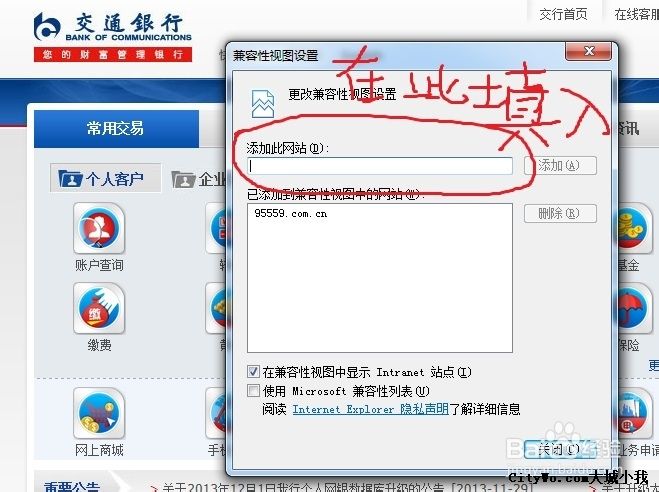2. 把交行和中行的网站添加到“兼容性视图中的网站”