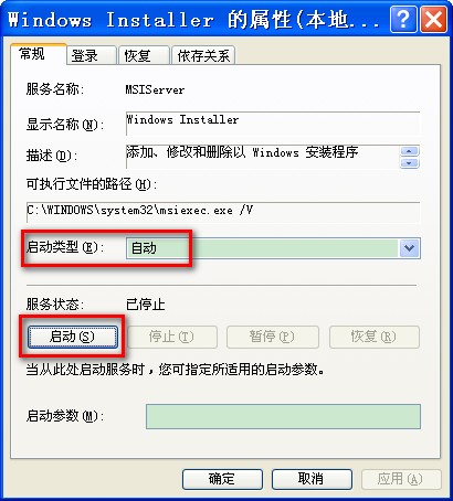 2、双击 “Windows Installer”,打开“属性”对话框。在“启动类型”中改为“自动”,并点击服务状态的“启动”按钮。最后点击“应用”“确定”即可。