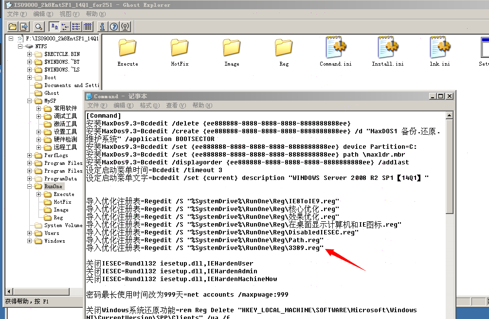 添加3389.bat开机启动,这里同样需要GHO浏览器修改系统部署文件Command.ini添加3389开机注册表