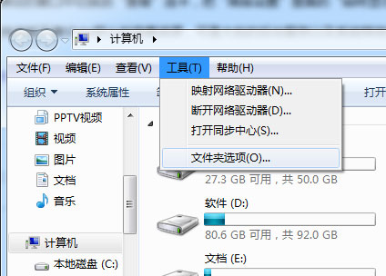 2、再按一下键盘的“Alt”建,窗口的的上部分会出现工具栏,选中工具栏“工具”里面的“文件夹选项”;