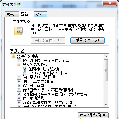 3、然后在弹出的窗口中切换到“查看”选卡,把“高级设置”里面的“始终显示图标,从不显示缩略图”前面打上小勾勾。