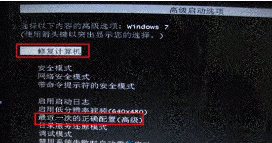 2、进入“系统高级选项菜单”后,选择“最后一次正确配置”;
