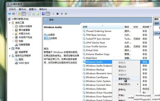 在计算机管理中,找到服务和应用程序分类下的服务,点开之后在右边的列表中找到Windows audio服务项,右键打开菜单点击重新启动,即可解决音频服务未启动的问题!