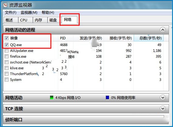 打开Win7资源监视器,切换到“网络”标签,然后在“网络活动的进程”中勾选“QQ.exe”。