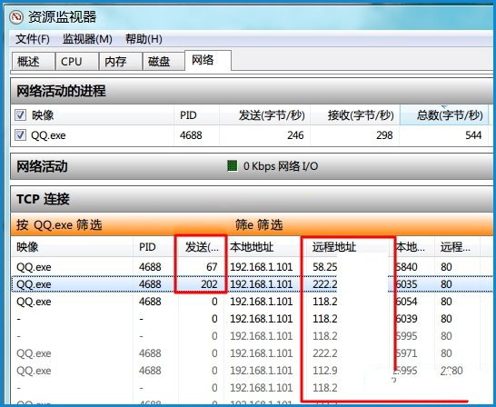这时,只要和你要查询IP地址的好友随便说一句话,再去查看“发送”列中有数据变化的进程,该进程的“远程地址”就是这位好友的IP地址了!