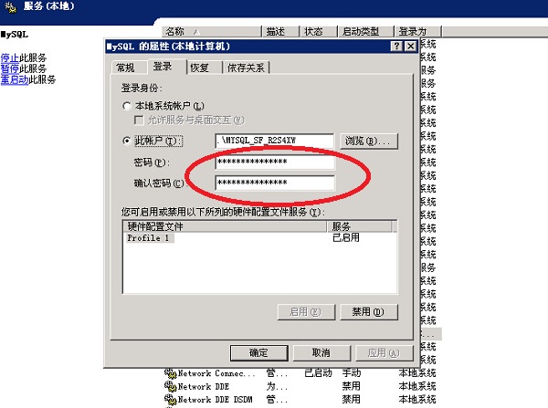 直接在服务器里开始-程序-管理工具-服务,找到MYSQL,右键-属性-安全-登录,在密码里面输入数据库相关本地用户的密码(下图),确定后回到服务,在MYSQL上右键-启动,OK,这回正常启动了,回到本地打开浏览器打开站点,顺利进入!修复完成了!