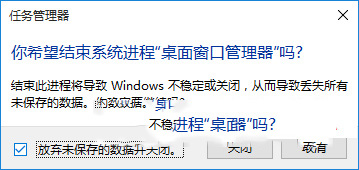 勾选下面的“放弃未保存的数据并关闭”,然后点击“关闭”即可结束“桌面窗口管理器”进程。