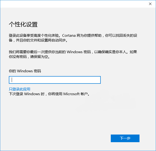 输入用户名和密码,点击“登录”,会显示“个性化设置”窗口,让你提供当前本地帐户的Windows登录密码。如图: