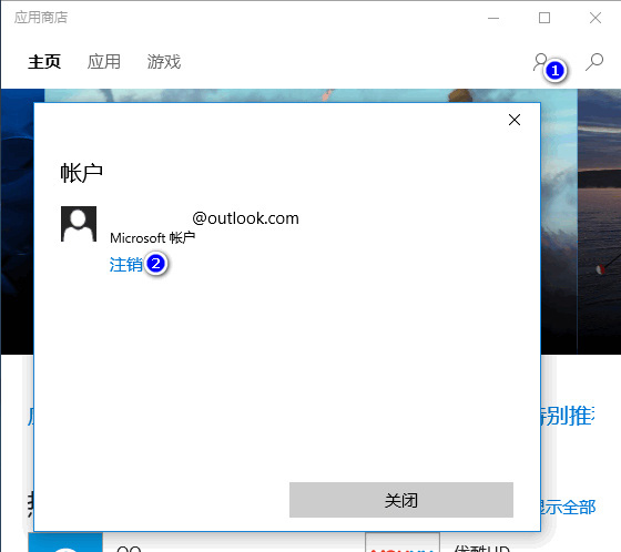 最后,如果你注重隐私和安全的话,别忘了再次点击应用商店顶部的帐户头像,点击你的微软帐户,这时会弹出注销帐户窗口。如图: