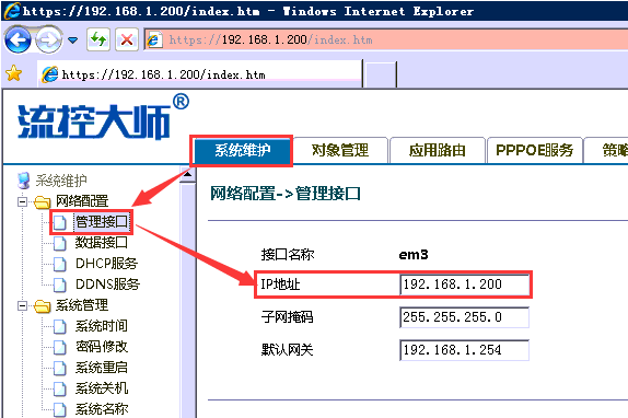 流控大师设置为:IP地址段:192.168.1.x/子网掩码:255.255.255.0/网关:192.168.1.254/Web管理IP:192.168.1.200