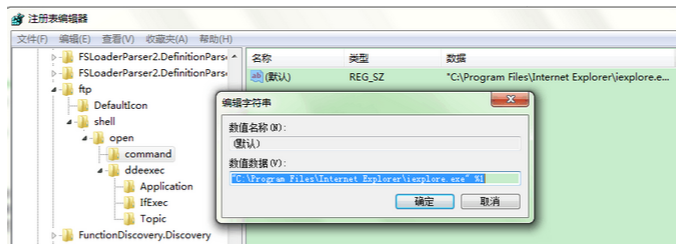64位注册表ftp目录项下该值为"C:/Program Files(x64)/Internet Explorer/iexplore.exe" %1