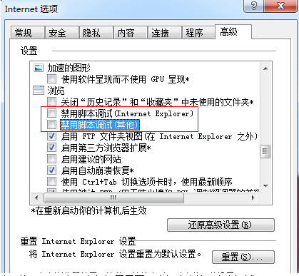 解决方法:在IE的Internet选项-高级设置里面取消勾选《禁用脚本调试(internet Explorer)》、《禁用脚本调试(其他)》这两个脚本调试并保存可以解决,如下图