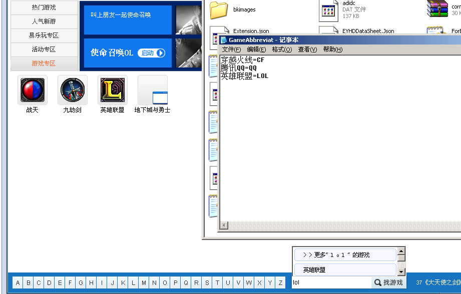 很容易就看懂了,三层资源里面的全称映射成另一个名称。这个文件应该是自动生成的,如果没有,可以手动创建一个,里面的内容可以自己编辑,把我们常用的一些有别名、简称的游戏添加进去。注,同一个游戏能添加多个别名,但是只有最后一个生效。 对于我们平常玩的一些游戏比如穿越火线、地下城与勇士、英雄联盟、腾讯QQ等我们都习惯简称,当桌面上没有这些游戏的快捷方式时,通过别名搜索会大大提高寻找游戏的速度。同时,有些游戏的名称里有多音字,这个时候搜索会有让人很郁闷。比如要找“藏地传奇”这个游戏,在三层资源里搜索可以用“CDCQ”搜索到,但是更新完后在客户机上不管是“CDCQ”还是“ZDCQ”都搜不到,在GameAbbreviat里手动添加了一条“藏地传奇=ZDCQ”,然后就可以直接搜索到了。
