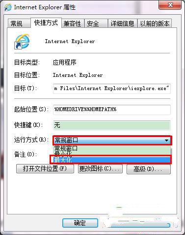 在【运行方式】的下拉选项中,选择【最大化】一项,然后按一下【确定】。