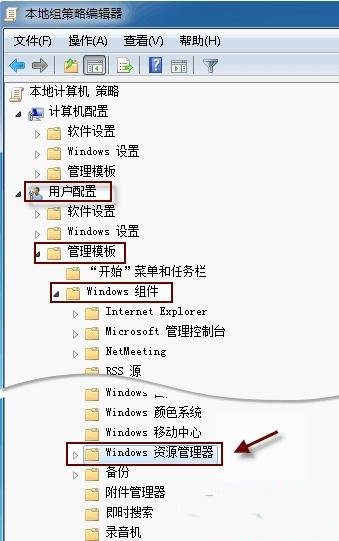 打开组策略编辑器,在左边本地计算机策略一栏请依次定位到“用户配置->管理模板->Windows 组件->Windows 资源管理器”。