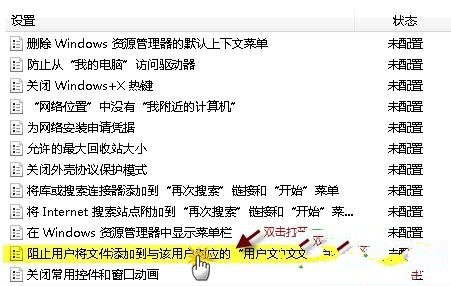 单击“Windows 资源管理器”,然后从右边细节窗口中找到‘阻止用户将文件添加到与该用户对应的“用户文件夹”文件夹的根目录下’,并双击打开。