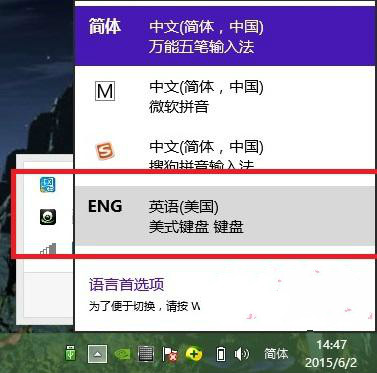1、不同于win7系统,在win8系统桌面右下角语言区域更改输入法为“英语 美式键盘”或其他输入法(不同机器可能稍有不同);