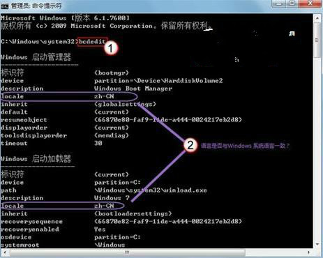 2、打开命令提示符窗口后,在窗口中输入“bcdedit”命令,然后按回车键确认,通过该命令来检查windows启动管理器和windows启动加载器中的locale对应的语言是否与windows7系统语言一致(如下图);