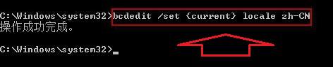 3、如果语言不一致的话,继续输入命令“bcdedit /set {current} locale zh-CN”并按回车键;