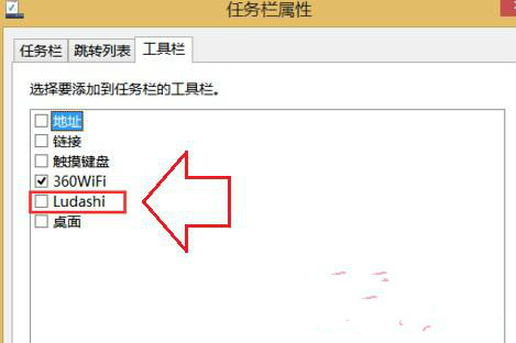 2、打开“任务栏和开始菜单属性”窗口后,在菜单栏中切换至“工具栏”选项卡,然后在列表中取消勾选“LuDaShi”选项,点击确定保存,最后就可以对LuDaShi文件进行删除。