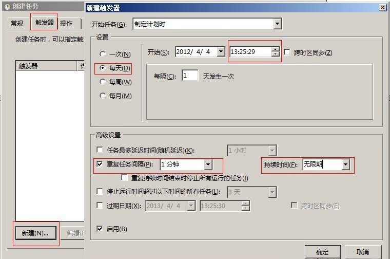 选择“触发器”选项,点击“新建”,创建任务执行时间,“重复任务间隔”这个选择后,后面有时间选择,是每小时,还是每分,可自己选择后再修改时间,再确定。