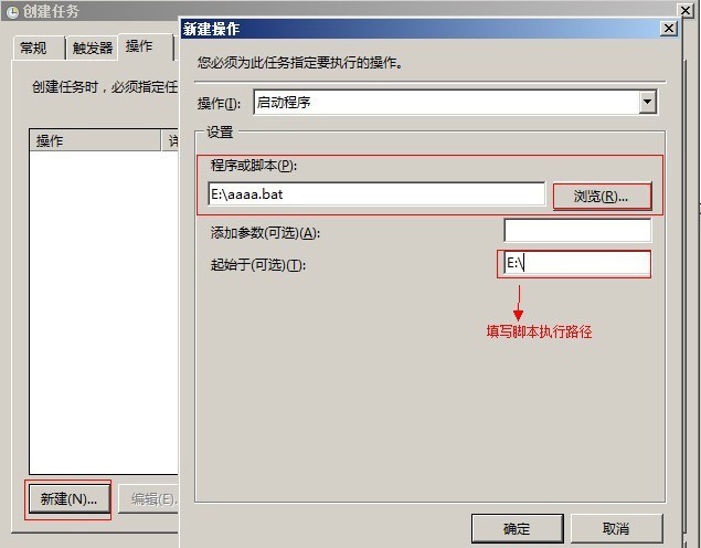 再来配置需要执行的“操作”,就是选择所写的程序或是BAT文件,这里很重要的配置是选择BAT文件后,在“起始于(可选)”这里一定要填写相应执行程序或是BAT文件的所在目录,要不然是执行不成功的。