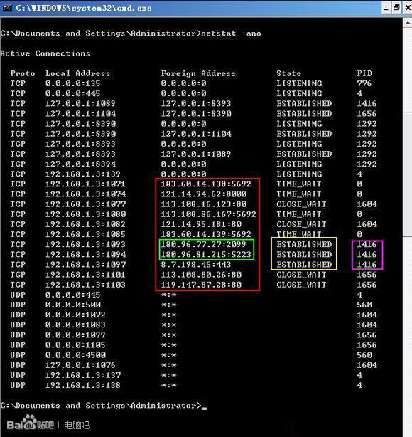 紫框是LOL的客户端进程PID,黄框表示己连接成功绿框部分为服务器的IP和端口号。
