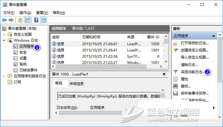 右键点击Win10开始按钮,在弹出的系统快捷菜单中选择“事件查看器”,然后在打开的“事件查看器”窗口的左侧定位至“Windows日志 - 应用程序”。如图: