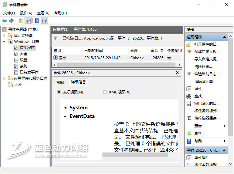 其实,任何一个系统事件都可以在系统自带的“事件查看器”中查看到相关信息,“磁盘检查”同样不例外。