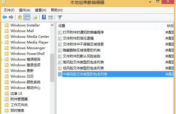 2、进入组策略。在组策略中,win8点击左边列表中的用户配置,依次展开管理模板-windows组件,找到并点击附件管理器;