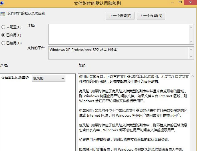 3、在该目录下,有几个组策略,可以进行手动设置。可以先把文件默认风险级别 设为“启用”“低风险”,将低风险文件类型设为“启用”,扩展名exe和msi。然后将文件附件指中不保留区域信息设为“启用”。