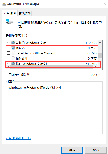 3、选中“以前的windows安装”和“临时windows安装文件”,点击确定即可