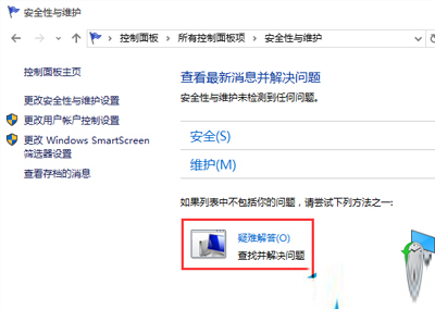 3、在出现的“安全性与维护”界面,单击“疑难解答”;