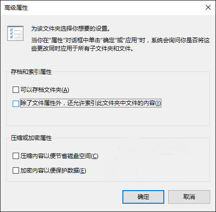 取消勾选“除了文件属性外,还允许索引此文件夹中文件的内容”,确定。