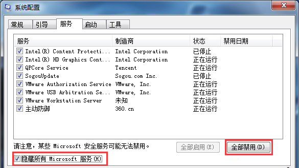 3、切换至“服务”选项卡,勾选“隐藏所有Microsoft服务”,并点击“全部禁用”按钮。当然,我们也可以根据实际需要,勾选某些必须要启动的服务项。最后点击“确定”完成设置。