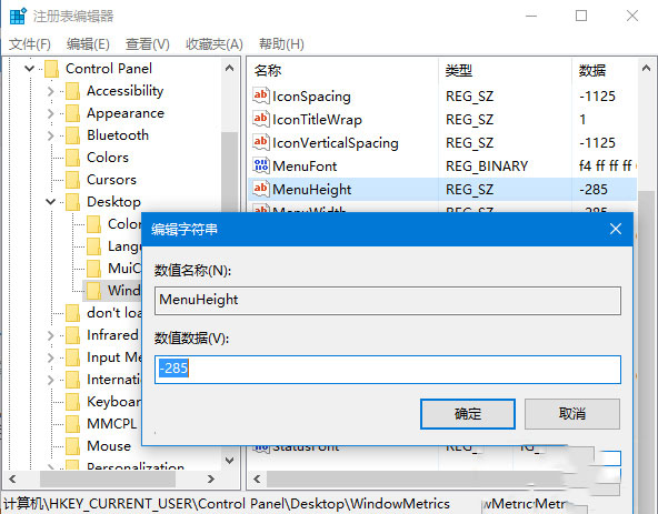 3、找到字符串值MenuHeight,双击打开后,发现“数值数据”默认为“-285”。这一数值是由以下公式计算得来: