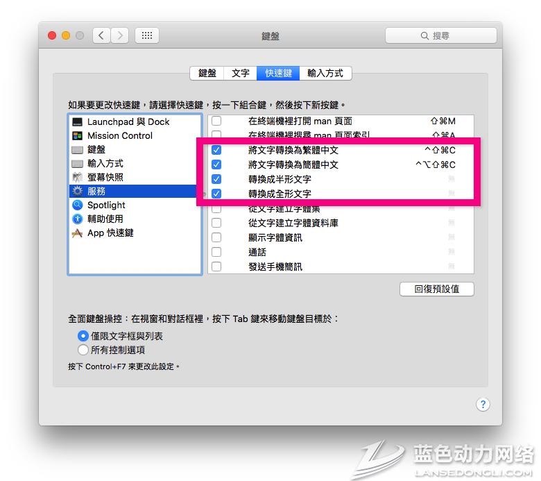 然后在「快捷键」分页下选取左边窗口的「服务」,接著在右侧窗口的「文字」项目下把「将文字转换为繁体中文」及「将文字转换为简体中文」两项打勾(如果常用到全形半行转换的话,也可把「转换成半形文字」及「转换成全形文字」顺便勾选):