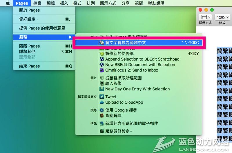 要使用时,只要先把要转换的文字选取,然后在选单中找到「服务」,就能在「服务」子选单中看到相关选项了: