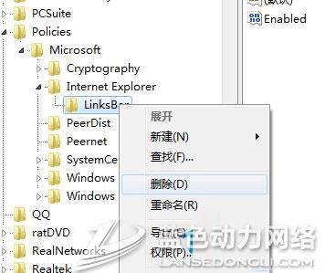 打开注册表编辑器,找到如下键值:HKEY_LOCAL_MACHINE/SOFTWARE/Policies/Microsoft/Internet Explorer,将Internet Explorer下方的LinksBar项目值直接删除: