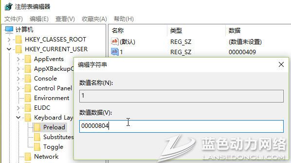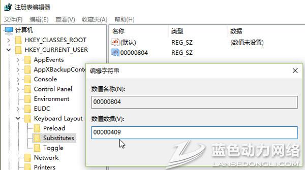 3、打开注册编辑器:HKEY_CURRENT_USER/KeyboardLayout/Preload,修改“1”的键值为“00000804”,然后在Substitutes项中新建字符串值,名称为“00000804”,键值为“00000409”,关闭注册编辑器,注销后重新登录。