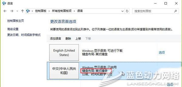 将中文语言上移到首项, 删除“English(UnitedStates)”语言项,设置完毕。这样中文(美式键盘)即是系统默认的首项输入法了,可以通过按“Ctrl+Shift”或者“Win+空格”来切换到微软拼音。