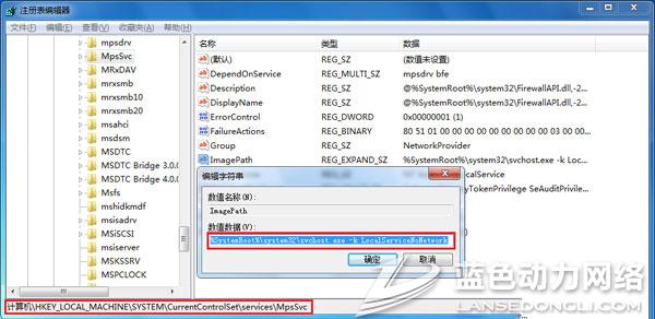 2、按“Windows+R”输入“regedit”回车打开注册表,并定位到HKEY_LOCAL_MACHINE/SYSTEM/CurrentControlSet/services/MpsSvc,确认ImagePath的数值数据是否相同,如“%SystemRoot%/system32/svchost.exe -k LocalServiceNoNetwork”。